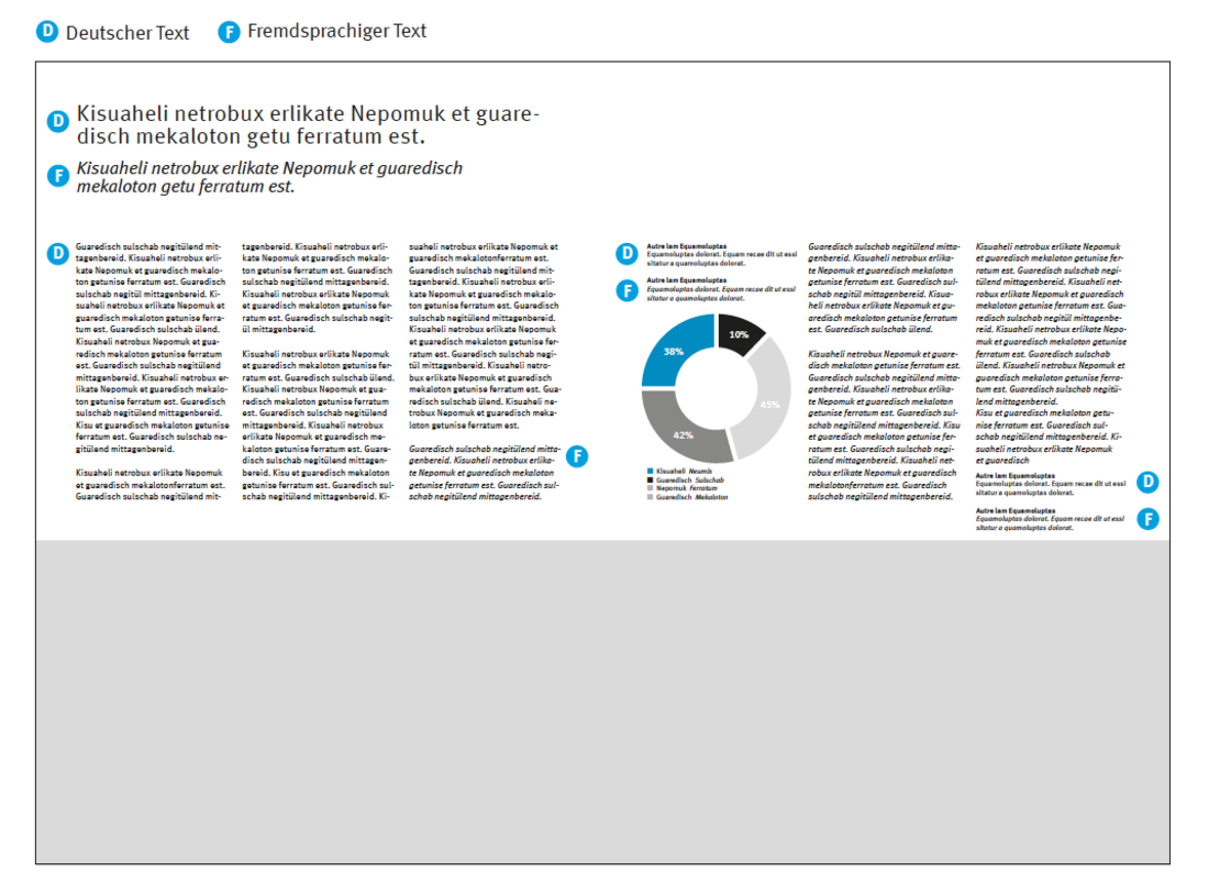 Für mehrsprachige Broschüren gilt die Regelung, dass der deutsche Text und der fremdsprachige Text jeweils untereinander oder nebeneinander positioniert werden.