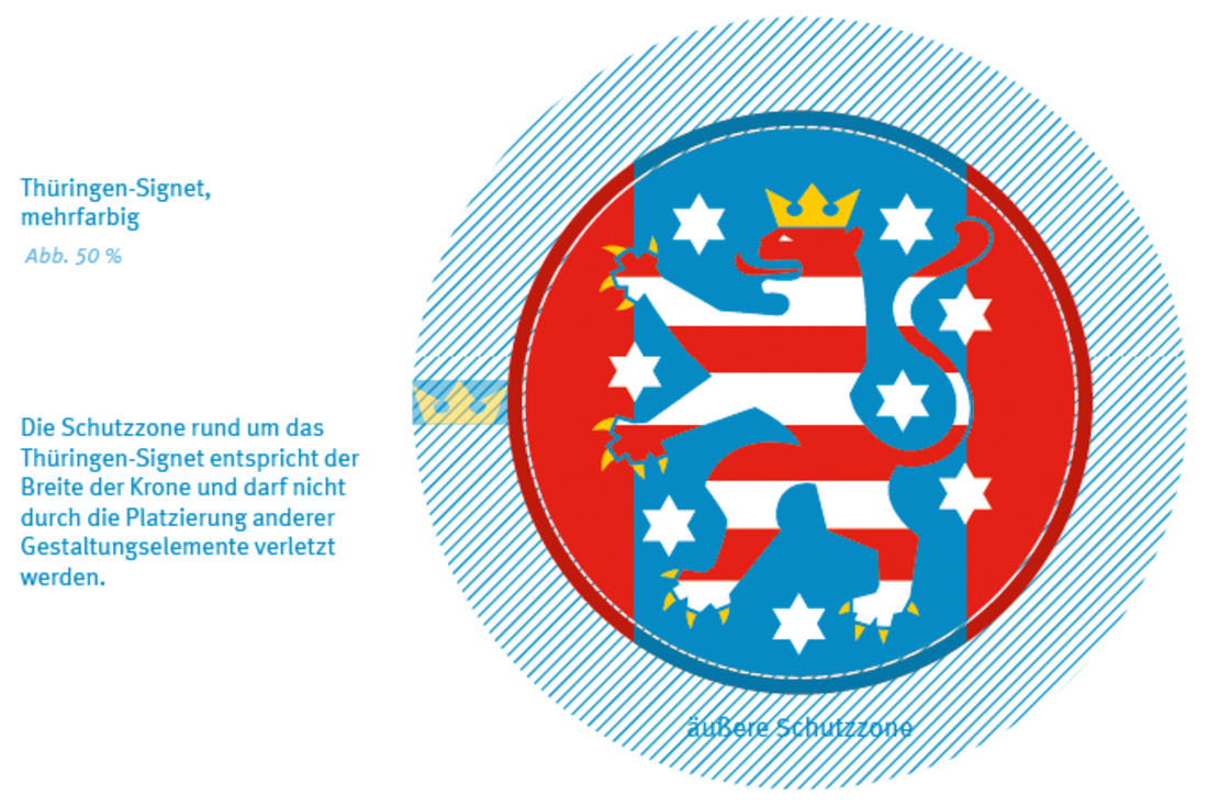 Die Farben des Signets sind Blau, Rot, Gelb und Weiß. Eine einfarbige Variante steht für Schwarz-Weiß-Umsetzungen zur Verfügung. Die entsprechenden elektronischen Vorlagen sind unter: www.thueringen.de/mhb abrufbar.